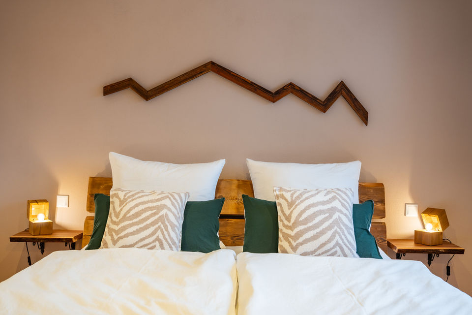 Tradition trifft Moderne. Erleben Sie bayrisches Flair auf 40 m²: Entspannen Sie auf unserer moosgrünen Relaxcouch oder träumen Sie in einem handgefertigten Balkenbett aus historischem Tennenholz. Das Highlight: Ihre XXL-Sonnenterrasse mit direktem Blick auf die Hochries.