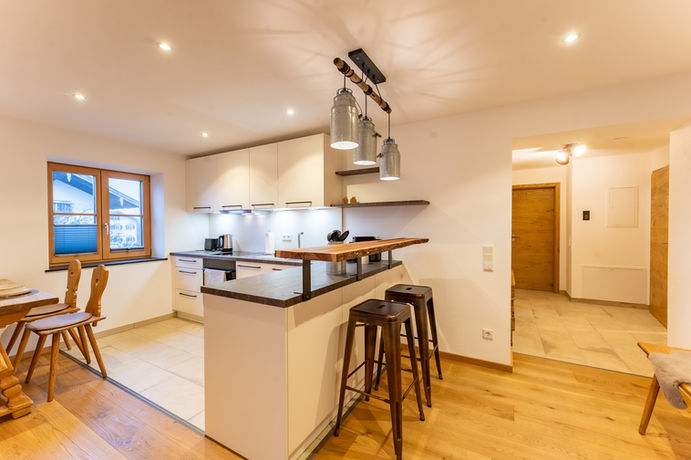 Stilvoller Charme mit Aussicht. Wo Stall-Design auf Wohlfühlatmosphäre trifft: Genießen Sie Ihren Espresso an der handgefertigten Kirschholz-Bar oder entspannen Sie am urigen Jogeltisch. Auf 52 m² erwartet Sie modernes Design und ein großer Balkon mit Logenplatz-Blick auf den Wendelstein.